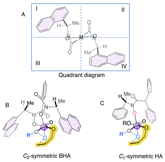 Plausible transition state of the C2-symmetric BHA (B) versus C1-HA (C) and quadrant diagram (A).
