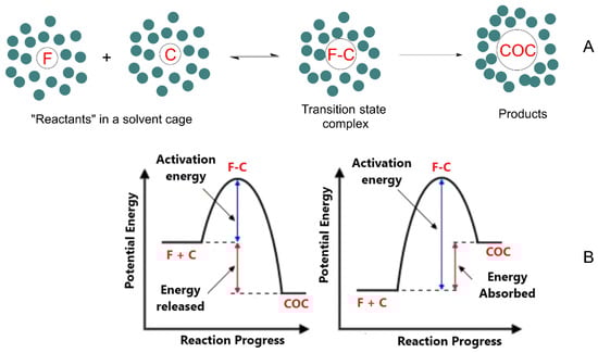 (A) Flavonoid-based cocrystal formation requires that the solvated flavonoid F and coformer C diffuse through the solvent to form an “encounter pair” F–C in a solvent cage. If the energy of the reactants is high enough to overcome the activation energy, Ea, the cocrystal COC will form, otherwise F–C will separate and cocrystal formation will not occur. In panel (B), the figure on the left is representative of an exergonic process, while the one on the right represents an endergonic process.