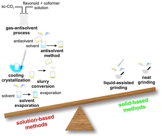 Solvent-based methods, Figure 5, have been widely used for synthesizing cocrystals and constitute the majority of the methods currently employed. Solvents play a crucial role affecting various cocrystal properties including their shape, solvate formation tendency, polymorphism and purity. Solvents are usually selected on the basis of the differential solubility of the starting materials (e.g., flavonoid and coformer): ideally, the solubility should be similar, because if they differ too much, the method is not effective [113,114].
