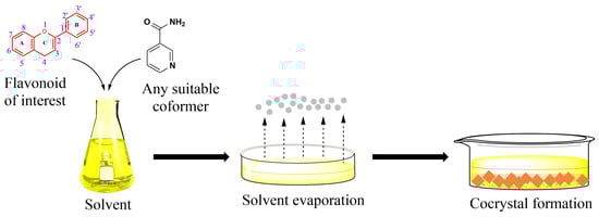 Solvent evaporation, together with slurry approaches, are the most widely employed methods in the synthesis of flavonoids cocrystals (Table S1 Supplementary Material). Evaporative cocrystallization is grounded on the supersaturation of the system caused by solvent evaporation. Solvent evaporation is a rather common method in cocrystal formation. Typically, an excess of solvent is employed for solubilizing the stoichiometric ratio of flavonoid (or polyphenol) and coformer. The solvent is then evaporated either at room temperature or by applying a vacuum to accelerate the process of drying. A wide spectrum of used solvents can be used, including acetone, acetonitrile, ethanol, ethyl acetate, methanol, tetrahydrofuran [60,65,66,92,118,119,120,121,122], as well as binary ethanol/ethyl acetate, ethanol/acetone, ethanol/dichloromethane, dichloromethane/isopropanol, dichloromethane/ethyl acetate, water/ethanol, and ternary methanol/ethyl acetate mixtures [60,65,70,86,123,124,125,126].