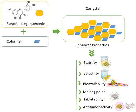 Cocrystallization has emerged as a promising strategy to address these limitations by modifying the physicochemical properties of flavonoids without altering their intrinsic biological activity. By improving parameters such as solubility, dissolution rate, stability, and bioavailability, cocrystallization can significantly enhance the performance of flavonoids in diverse applications. In the food sector, this enables their use as Active Food Ingredients (AFIs) with improved functional properties, while in pharmaceuticals, it opens new opportunities for the formulation of more effective and stable dosage forms, including tablets, capsules, and controlled-release systems. This dual potential positions cocrystallization as a valuable tool in both nutrition science and drug development, bridging the gap between natural product chemistry and practical applications [34].