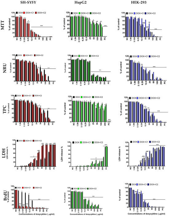 The inhibitory effect of doxycycline (DOX) and its interaction with cannabidiol (C) at concentrations of 1.56 µg/mL (DOX + C1) and 3.12 µg/mL (DOX + C2) on three human SH-SY5Y, HepG2, and HEK-293 cells. The study was performed using five assessment tests: mitochondrial activity (MTT test), lysosomal activity (NRU test), proliferation (TPC test), cell membrane integrity (LDH test), and DNA synthesis (BrdU test). Data are presented as mean ± SD (standard deviation) (n = 3). Negative control (NC); positive control (PC). (* p ≤ 0.05, ** p ≤ 0.01, *** p ≤ 0.001).