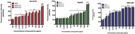 Production of reactive oxygen species (ROS) after 72 h of treatment of SH-SY5Y, HepG2, and HEK-293 cells with doxycycline and co-treatment with CBD at concentrations of 1.56 µg/mL (DOX + C1) and 3.12 µg/mL (DOX + C2). Data are presented as mean ± SD (standard deviation) (n = 3) (* p ≤ 0.05; ** p ≤ 0.01; *** p ≤ 0.001).