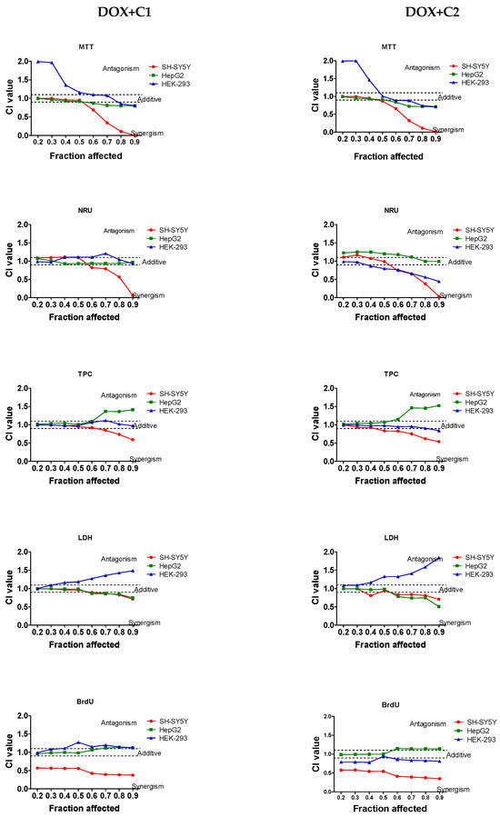 In both methods, an increase in IC50 values was observed only for the DOX + C1 mixture. In contrast, a decrease in IC50 values was noted for the DOX + C2 mixture in four assays—MTT, NRU, LDH, and BrdU—compared to the DOX + C1 mixture (Table 1).