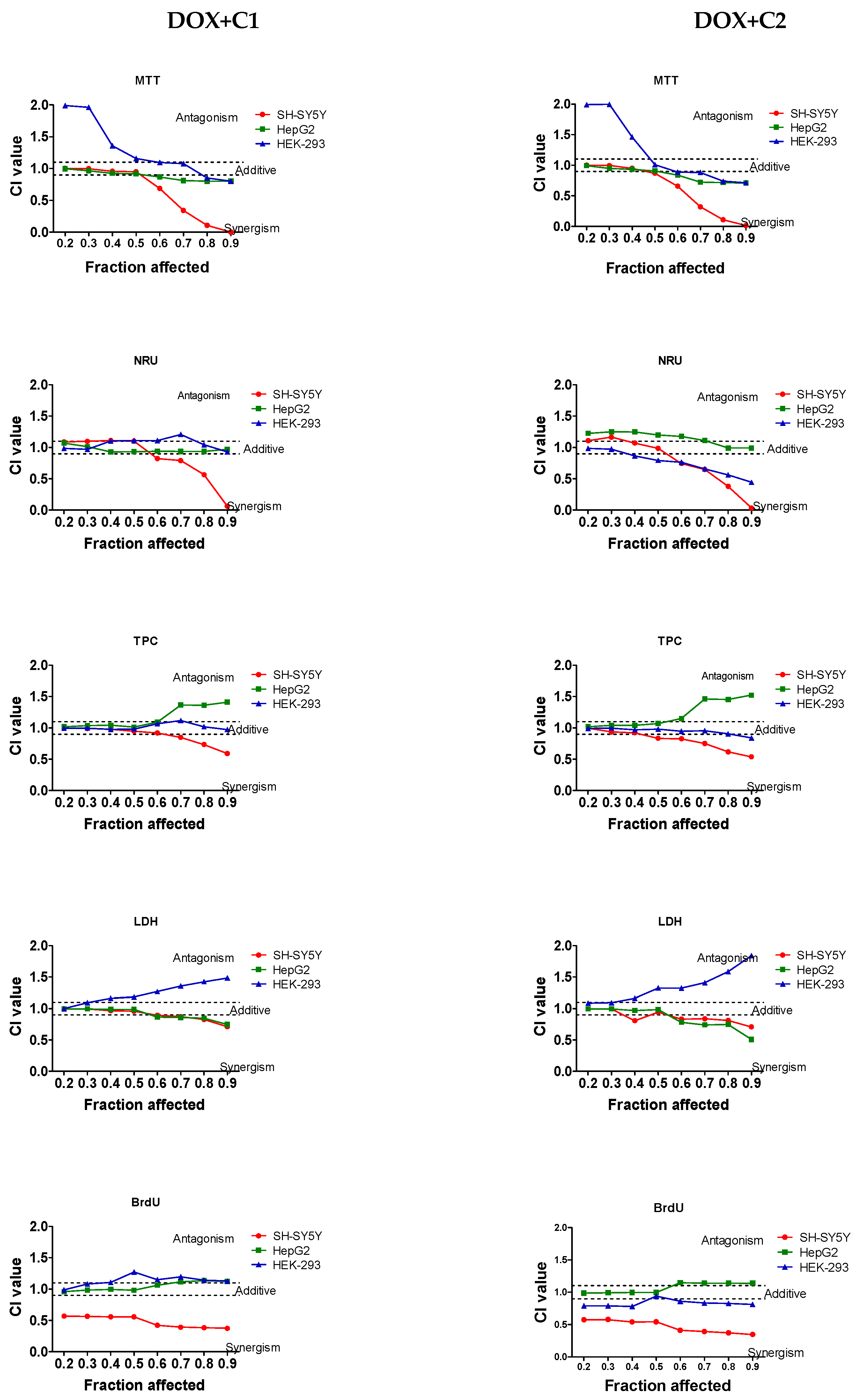 | Cell Lines | Assay | DOX | DOX + C1 | CI | DOX + C2 | CI |