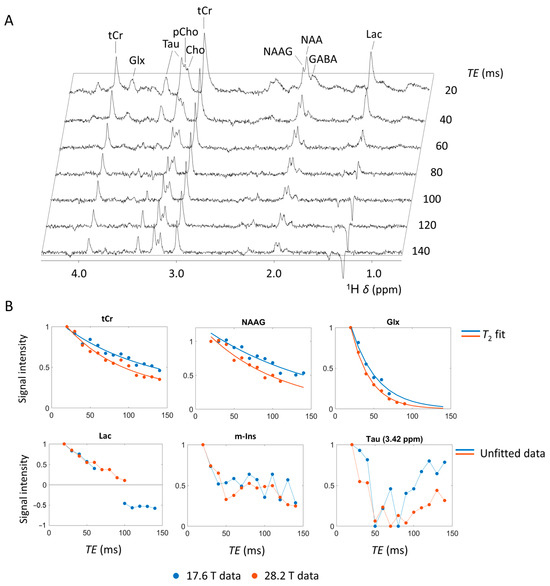 Other cerebral metabolite signals showed a more complex intensity evolution with increasing echo times, i.e., not following a mono-exponential decay (see Figure 2B). These non-mono-exponential decays are well documented in the literature and come from J-coupling effects within the respective spin systems [51,52]. J-coupling between nuclei causes anti-phase and rephasing behavior, as spin interactions cause signal components to evolve anti-phase at TE ≈ 1/2 J−1 and rephasing at TE ≈ J−1, producing the characteristic oscillatory signal pattern seen in metabolites such as Lac, Tau, and m-Ins. Here, most noticeable, the Lac signal at δ = 1.31 ppm (3CH3) showed an anti-phase pattern between 60 ms and 100 ms and a 180° phase shift at echo times above 100 ms. For Lac, the J-coupling is estimated in the range of 6.9–7.3 Hz, or approximately 1/140 ms [51]. Consequently, the Lac signals are negative in-phase at TE = J−1 ~ 140 ms and anti-phase at TE = 1/2 J−1 ~ 70 ms. This characteristic facilitates distinct lactate identification by applying echo times around 140 ms, but also imposes limitations on echo times due to the complex anti-phase behavior observed within the 60–100 ms echo time range. Other metabolites showing a complex echo time evolution—Tau at δ = 3.42 ppm (1CH2) and δ = 3.25 ppm (2CH2), pCho at δ = 3.21 ppm (N(CH3)3), and Cho at δ = 3.19 ppm (N(CH3)3)—contributed to J-coupling induced signal dephasing. For Tau and m-Ins, the presented signal evolution was consistent with previous observation [53], showing an initial steep signal decline with a local minimum around TE = 50–80 ms due to anti-phasing (TE ~ 1/2 J−1), after which the signal recovered between TE = 100–140 ms due to rephasing (TE ~ J−1). Estimation of T2 relaxation times for metabolites with a more complex signal intensity evolution, requires quantum mechanics simulations, as previously reported [53,54]. Overall, our results demonstrate that even at ultra-high fields of 17.6 T and 28.2 T, the T2 values of the main cerebral metabolites remain sufficiently long to permit reliable identification and quantification. This suggests that the use of specialized sequences designed for very short echo times, such as STEAM, may not always be mandatory at ultra-high field. Instead, moderately longer echo times can be employed to retain adequate metabolite signal while simultaneously suppressing macromolecular contributions, thereby improving spectral clarity and facilitating more accurate metabolite analysis.