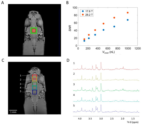 The tiny size of the zebrafish brain, in combination with its shape, limits the utilization of larger voxel sizes. Here, we explored the limits of acquisition of highly resolved single voxel localized MRS spectra in the zebrafish brain in terms of the voxel size and number of averages required for cerebral metabolite identification and quantification. We acquired spectra with ns = 1024 in approximately 34 min with Vvoxel ranging between 1000 μL and 125 nL, obtained from the zebrafish midbrain region (Figure 3A) at 17.6 T and 28.2 T. Overall, a noteworthy 40% increase in SNR was observed at 28.2 T compared to 17.6 T (Figure 3B). However, the impact of increased magnetic field strength on elevated T1 relaxation times was not accounted for [43,55,56]. Hence, it is plausible that a more significant enhancement of the SNR could be achieved by adjusting the repetition time to accommodate the increase in T1. Given the small size of the zebrafish brain and its predominantly lipid-rich surrounding, elucidated in Supplementary Figure S1, voxels with isotropic dimensions surpassing beyond the brain tissue showed broad and predominant lipid signals. These lipid signals were clearly visible around δ = 1.3 ppm and δ = 2.0 ppm and overlapped with various cerebral metabolites. In the midbrain, with voxel volumes exceeding Vvoxel = 512 nL (corresponding to a voxel size of 0.8 × 0.8 × 0.8 mm3), interference from lipid signals became noticeable. In contrast, for the forebrain and hindbrain, being smaller and more elongated than the midbrain, lipid signal interference became apparent at Vvoxel = 216 nL, corresponding to a voxel size of 0.6 × 0.6 × 0.6 mm3. Both at the UHF strength of 17.6 T and 28.2 T, spectra were acquired conducive to the identification and quantification of several cerebral metabolites, even at Vvoxel = 125 nL. To our knowledge, our results represent the use of the smallest Vvoxel demonstrated to date for localized MRS on brain tissue while still allowing for reliable quantification of major brain metabolites. This is significantly smaller than the spatial resolutions typically reported in clinical and preclinical applications. In comparison, for human localized MRS at 3 T, Vvoxel of approximately 4 mL are recommended for reliable quantification of NAA, tCr, and m-Ins [39]. For preclinical applications, Vvoxel in the range of tens of µL are typically utilized [57].
