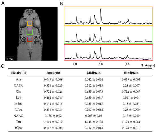 Identification of cerebral metabolites was performed by comparison of obtained 1H spectra to reference spectra of brain metabolites [58,81,82] and on our previously obtained NMR spectra of zebrafish brain extracts [29]. Quantification of metabolites was executed using Chenomx NMR suite 8.2 (Chenomx Inc., Edmonton, AB, Canada), using the following signals per metabolite: Alanine (Ala) 3CH3 at δ = 1.47 ppm; γ-aminobutyric acid (GABA) 3CH2 at δ = 1.89 ppm; Glutamate (Glu) 4CH2 at δ = 2.45 ppm; Glutamine (Gln) 2CH at δ = 3.75 ppm; Lactate (Lac) 2CH at δ = 4.09 ppm; myo-Inositol (m-Ins) at δ = 3.61 ppm; N-acetylaspartate (NAA) 2CH3 at δ = 2.01 ppm; N-acetylaspartate-glutamate (NAAG) 2CH3 at δ = 2.01 ppm; taurine (Tau) 2CH2 at δ = 3.25 ppm; total choline (tCho = GPC + pCho) N(CH3)3 at δ = 3.20 ppm. Available reference libraries provided by Chenomx were utilized. Metabolite concentrations were estimated relative to tCr [83]. Statistical analysis for NMR quantification involved one-way analysis of variance (ANOVA) by OriginPro v.8 (Originlab, Northhampton, MA, USA). Multiple comparisons were conducted using t-test, and significance was established with p < 0.05. Unless specified otherwise, SNR was estimated based on the tCr signal at a chemical shift δ = 3.03 ppm, utilizing built-in TopSpin functionalities with