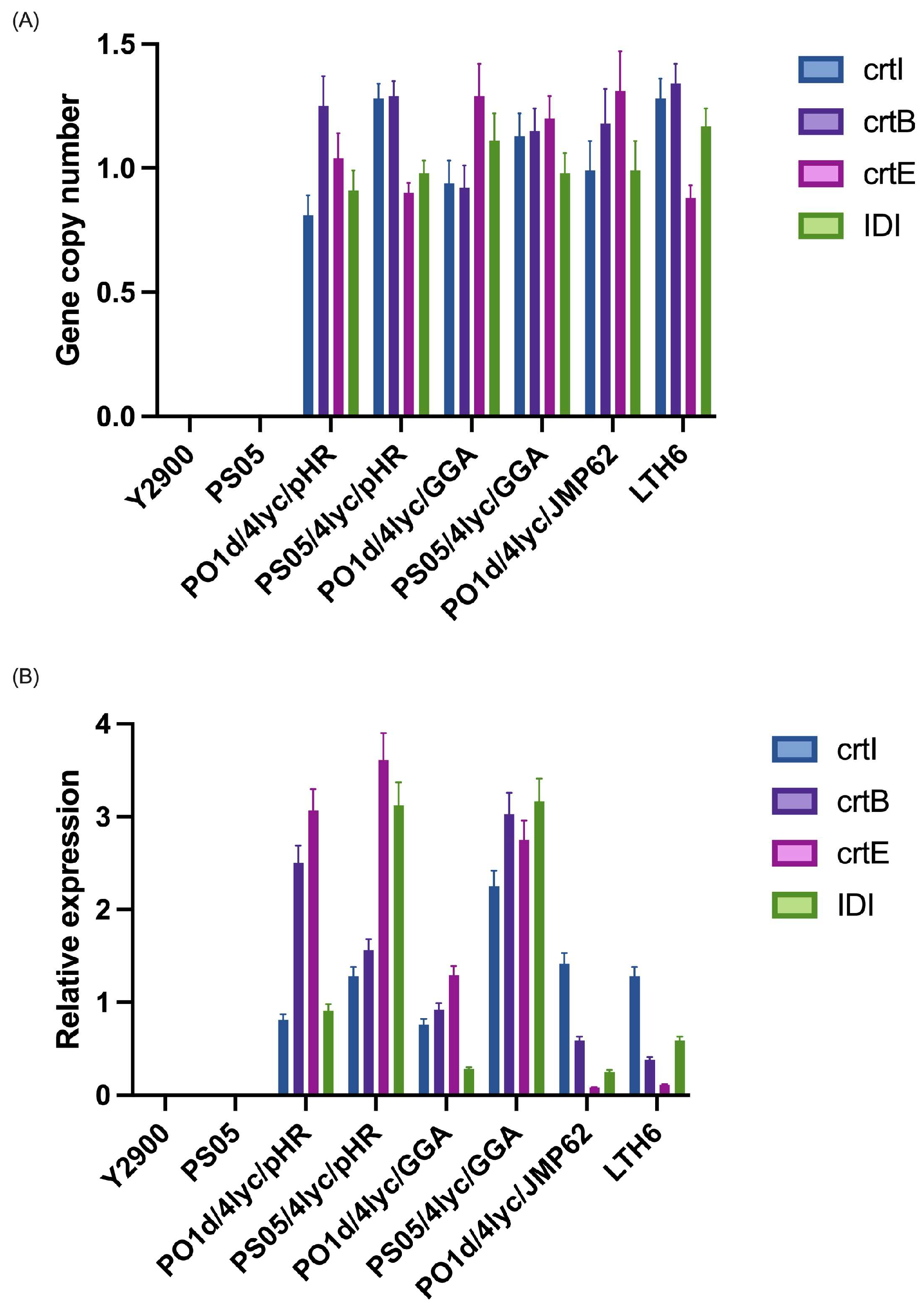 Figure 2B). No detectable transcripts were found in the control strains (Y2900 and PS05), confirming the absence of the lycopene pathway prior to transformation. In strains containing the replicative plasmid (pHR), transcript levels were the highest overall, although not uniform across all four genes. Typically, two genes within the plasmid showed stronger expression, while the remaining two were less active. Interestingly, the pattern was not identical between the two genetic backgrounds: in the PS05 background,