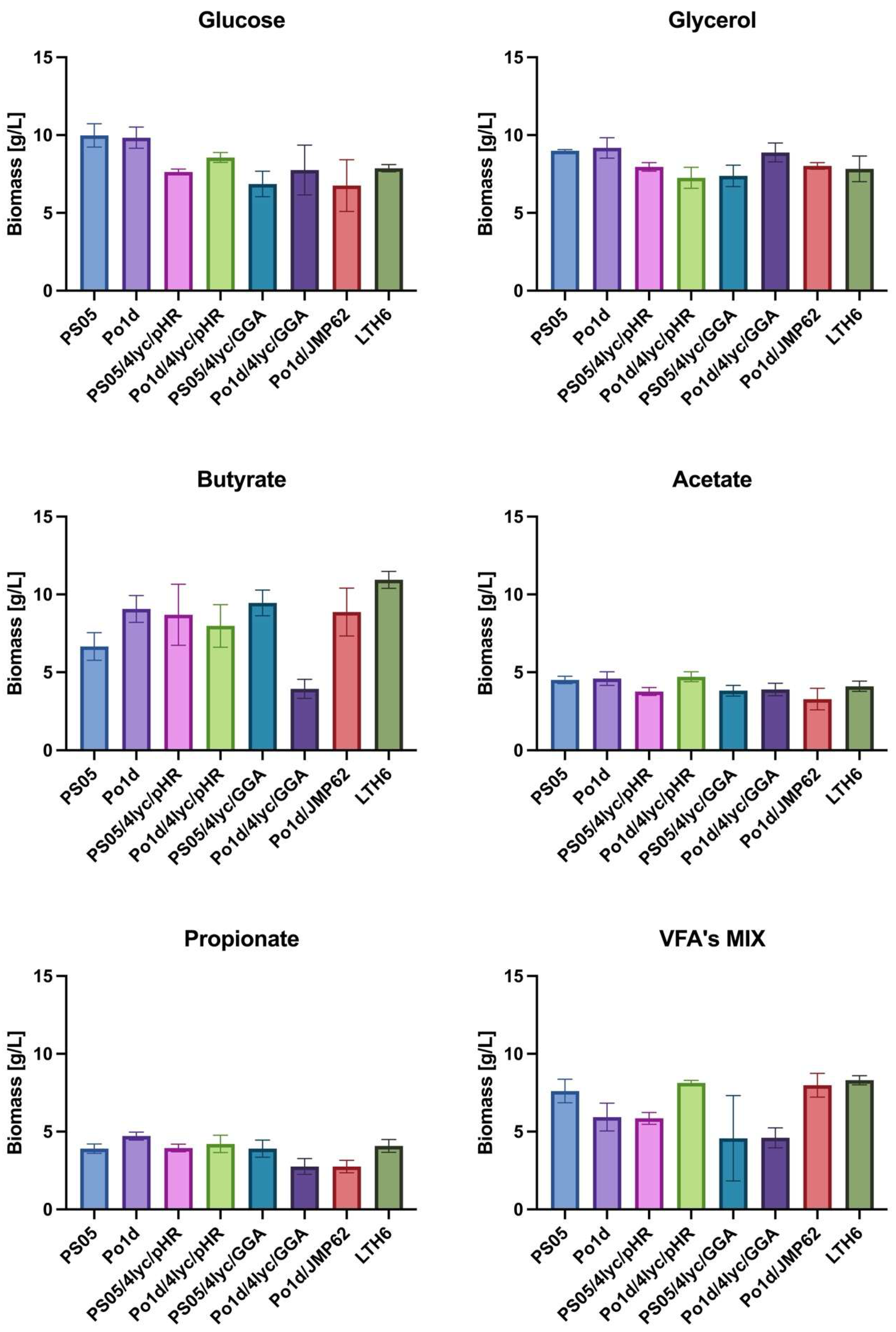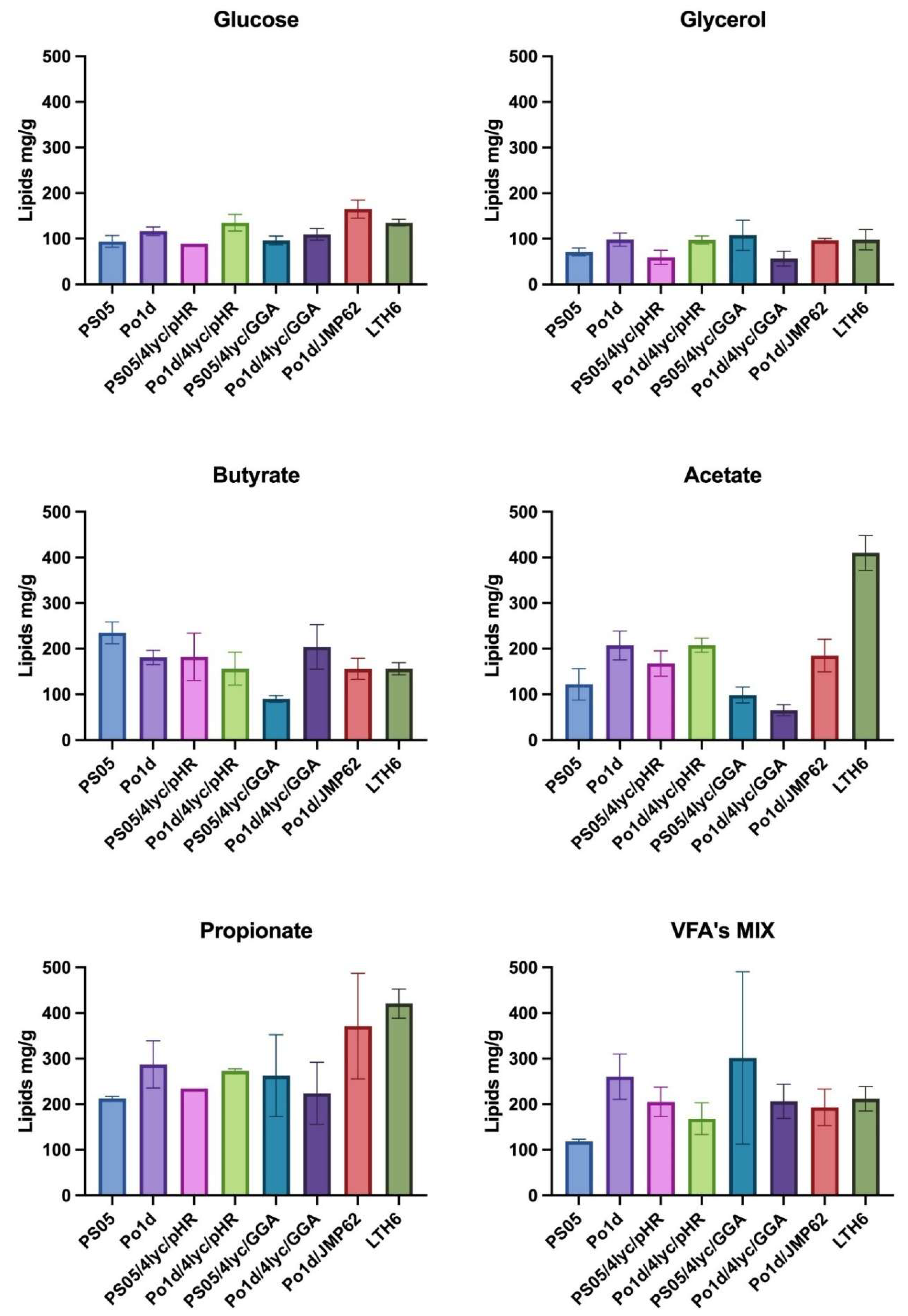 Figure 5) were observed on the SCFA mixture (≈302 mg/g) and on propionate (≈263 mg/g), conditions favoring enhanced acetyl-CoA generation and fatty acid turnover. A comparable effect of mixed or waste-derived substrates was previously described by Kot and colleagues [