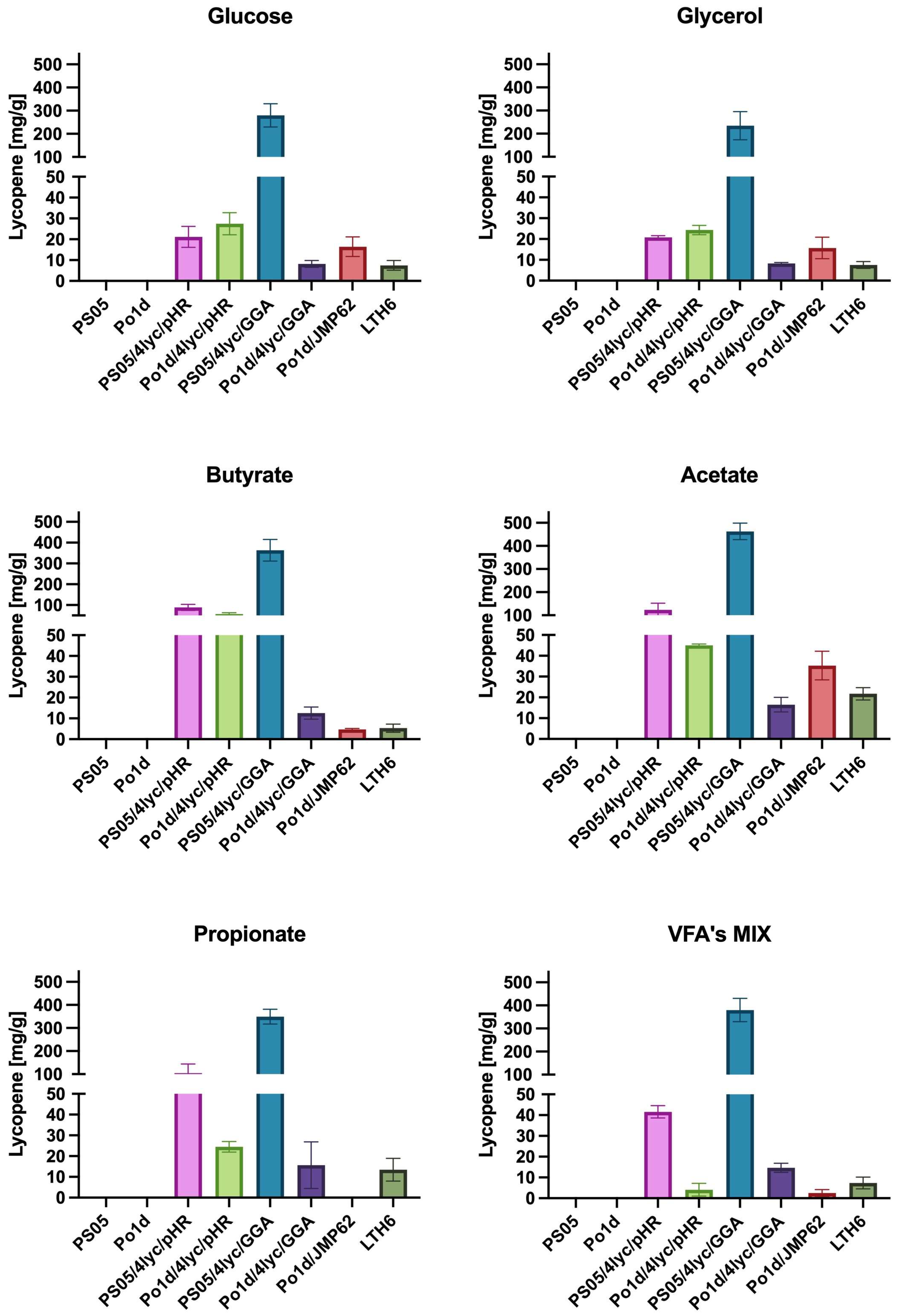 The utilization of SCFAs by Y. lipolytica offers a solution that combines ecological and economic advantages. It not only reduces the negative environmental impact of these compounds but also enables their conversion into valuable biotechnological products, including lipids and carotenoids. Thus, the use of SCFAs as an inexpensive and renewable carbon source can significantly lower bioproduction costs while supporting a sustainable lycopene biosynthesis process in Y. lipolytica.