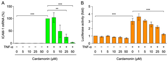 TNF-α has been shown to predominantly up-regulate the expression of ICAM-1 at the mRNA level [47,48]. Therefore, A549 cells were treated with cardamonin for 1 h, stimulated with TNF-α for 2 h, and total RNA was then isolated. The effects of cardamonin on ICAM-1 mRNA expression were investigated by a quantitative polymerase chain reaction (PCR). TNF-α markedly increased ICAM-1 mRNA expression, while cardamonin reversed this effect at concentrations of 10–50 µM (Figure 3A).