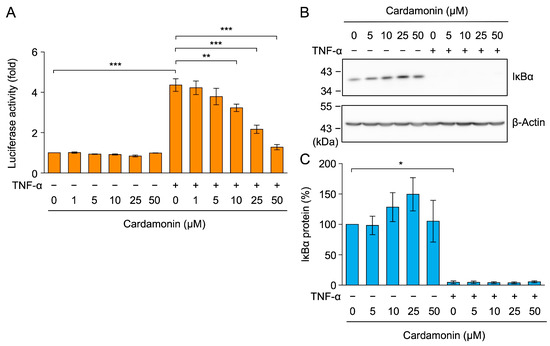 Cardamonin did not affect TNF-α-induced IκBα degradation. (A) The NF-κB-responsive luciferase gene was used for the reporter assay. A549 cells were treated with cardamonin for 1 h, followed by a 2.5-h stimulation with (+) or without (−) TNF-α (2.5 ng/mL) in the presence or absence of cardamonin (1–50 µM). Luciferase activity (fold) (orange bars) is presented as the mean ± standard error (n = 3). (B,C) A549 cells were treated with cardamonin for 1 h, followed by a 15-min stimulation with (+) or without (−) TNF-α (2.5 ng/mL) in the presence or absence of cardamonin (5–50 µM). Representative blots from three independent experiments are displayed (B). The IκBα protein (%) (cyan bars) is presented as the mean ± standard error (n = 3) (C). * p < 0.05, ** p < 0.01, and *** p < 0.001. Original blots are presented in Figures S2–S5.