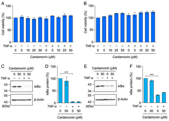 Cardamonin did not block TNF-α-induced IκBα degradation in MCF-7 or HT-1080 cells. (A,B) MCF-7 cells (A) and HT-1080 cells (B) were treated with cardamonin for 1 h, followed by a 6-h stimulation with (+) or without (−) TNF-α (2.5 ng/mL) in the presence or absence of cardamonin (5–50 µM). Cell viability (%) (blue bars) is presented as the mean ± standard error (n = 3). No significant differences were observed. (C–F) MCF-7 cells (C,D) and HT-1080 cells (E,F) were treated with cardamonin for 1 h, followed by a 15-min stimulation with (+) or without (−) TNF-α (2.5 ng/mL) in the presence or absence of cardamonin (50 µM). Representative blots from three independent experiments are displayed (C,E). The IκBα protein (%) (cyan bars) is presented as the mean ± standard error (n = 3) (D,F). *** p < 0.001. Original blots are presented in Figures S16–S23.