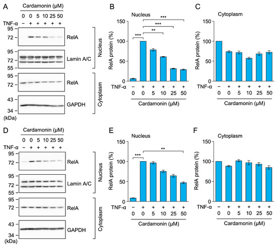 Cardamonin inhibited the TNF-α-induced nuclear translocation of RelA in MCF-7 and HT-1080 cells. (A–F) MCF-7 cells (A–C) and HT-1080 cells (D–F) were treated with cardamonin for 1 h, followed by a 30-min stimulation with (+) or without (−) TNF-α (2.5 ng/mL) in the presence or absence of cardamonin (5–50 µM). Representative blots from three independent experiments are displayed (A,D). RelA protein (%) in the nucleus (B,E) and cytoplasm (C,F) (cyan bars) are presented as the mean ± standard error (n = 3). ** p < 0.01 and *** p < 0.001. Original blots are presented in Figures S24–S39.