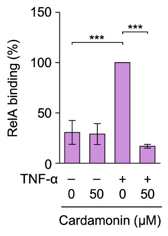Cardamonin inhibited TNF-α-induced RelA binding to the ICAM-1 promoter. A549 cells were treated with cardamonin for 1 h, followed by a 30-min stimulation with (+) or without (−) TNF-α (2.5 ng/mL) or cardamonin (50 µM). RelA binding (%) (purple bars) is presented as the mean ± standard error (n = 3). *** p < 0.001.
