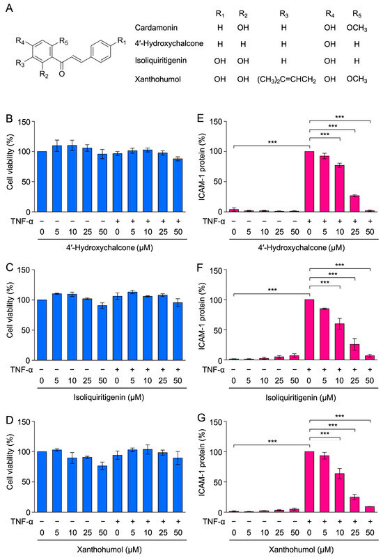Chalcone derivatives inhibited TNF-α-induced ICAM-1 expression. (A) Structures of 4′-hydroxychalcone, isoliquiritigenin, and xanthohumol. (B–G) A549 cells were treated with 4′-hydroxychalcone (B,E), isoliquiritigenin (C,F), and xanthohumol (D,G) for 1 h, followed by a 6-h stimulation with (+) or without (−) TNF-α (2.5 ng/mL) in the presence or absence of 4′-hydroxychalcone, isoliquiritigenin, and xanthohumol (5–50 µM). Cell viability (%) (blue bars) is presented as the mean ± standard error (n = 3) (B–D). No significant differences were observed (B–D). ICAM-1 expression (%) (magenta bars) is presented as the mean ± standard error (n = 3) (E–G). *** p < 0.001.