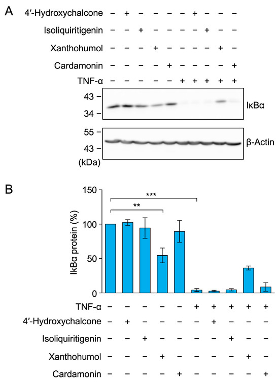 4′-Hydroxychalcone and isoliquiritigenin did not affect TNF-α-induced IκBα degradation. (A,B) A549 cells were treated with 4′-hydroxychalcone, isoliquiritigenin, and xanthohumol for 1 h, followed by a 15-min stimulation with (+) or without (−) TNF-α (2.5 ng/mL) in the presence or absence of the compounds (each at 50 µM). Representative blots from three independent experiments are displayed (A). IκBα protein (%) (cyan bars) is presented as the mean ± standard error (n = 3) (B). ** p < 0.01 and *** p < 0.001. Original blots are presented in Figures S40–S43.