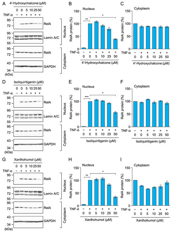 We also examined the effects of chalcone derivatives on the nuclear translocation of RelA. Following the TNF-α stimulation, the amount of RelA markedly increased in the nuclear fractions, but remained unchanged in the cytoplasmic fractions (Figure 11A–I). At a concentration of 50 µM, 4′-hydroxychalcone, isoliquiritigenin, and xanthohumol inhibited the TNF-α-induced nuclear translocation of RelA (Figure 11A,B,D,E,G,H).