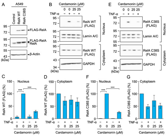 Cardamonin contains an α,β-unsaturated carbonyl moiety that undergoes a Michael addition reaction with cysteine residues [55]. Therefore, we investigated whether cardamonin directly targeted the C38 of RelA to prevent its nuclear translocation. Lentivirus transfection was used to establish A549 cells stably expressing the FLAG-tagged RelA WT and RelA C38S mutant. In Western blotting, similar FLAG-RelA WT and FLAG-RelA C38S levels were observed in stable A549 transfectants (Figure 12A). Cardamonin at 25 µM inhibited the TNF-α-induced nuclear translocation of FLAG-RelA WT (Figure 12B–D). Unexpectedly, cardamonin at 25 µM also inhibited the nuclear translocation of FLAG-RelA C38S (Figure 12E–G). These results suggest that cardamonin did not primarily target C38 in RelA.