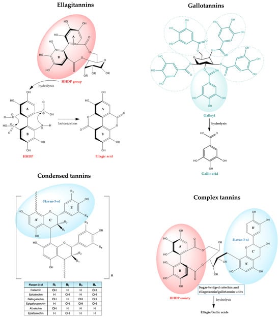 Tannins are structurally diverse polyphenols, generally classified into hydrolyzable tannins (including ellagitannins and gallotannins), condensed tannins, complex tannins (fusing hydrolysable and condensed motifs), and the less prevalent phlorotannins found in marine algae [25,26,27,28]. Condensed tannins, also known as proanthocyanidins, well-studied for their potent antioxidant and anti-inflammatory properties, are polymers of flavan-3-ol units that are resistant to hydrolysis [28].