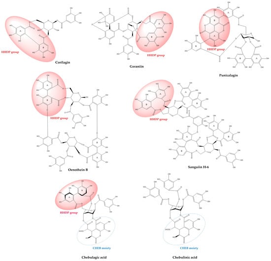 Chemical structures of selected ellagitannins, showing characteristic HHDP and chebuloyl groups.