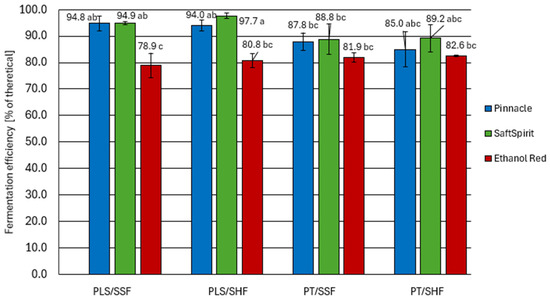 Fermentation efficiency of potato mashes. PT—pressure-thermal starch liberation method; PLS—pressureless starch liberation method; SHF—separate hydrolysis and fermentation; SSF—simultaneous saccharification and fermentation (mean values with different letters differ significantly; multivariate analysis of variance, p < 0.05).
