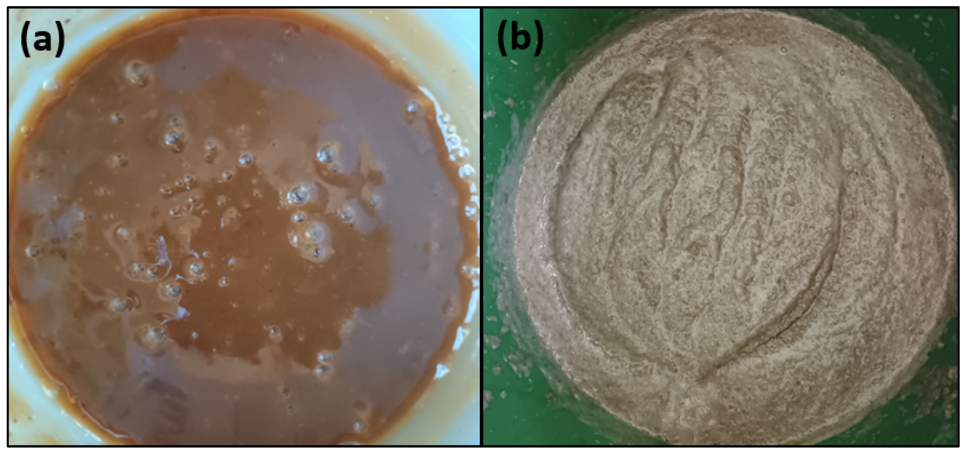Appearance of potato sweet mashes prepared by the following methods: (a) pressure-thermal (PT); (b) pressureless starch liberation (PLS).