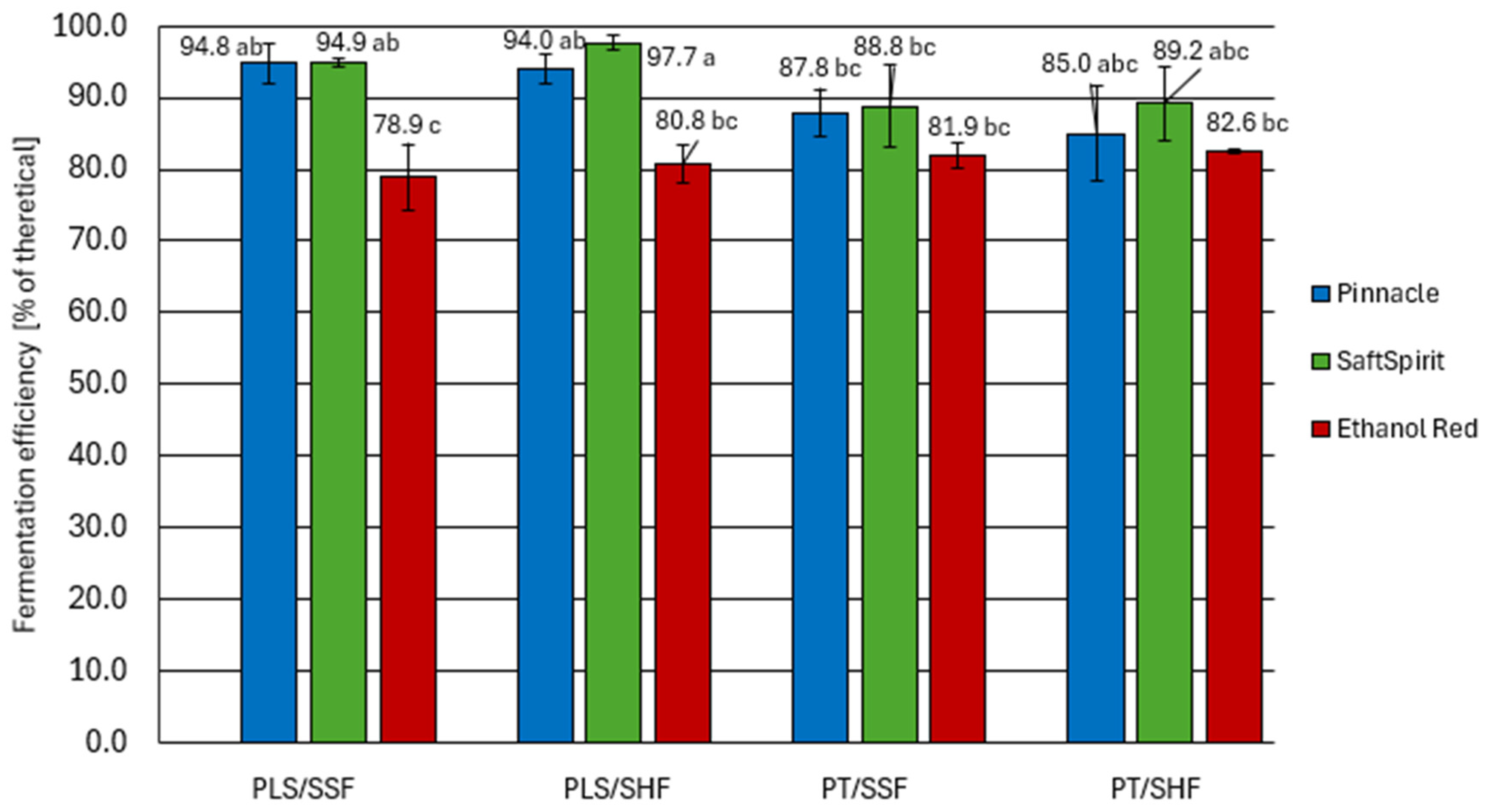 Fermentation with the Ethanol Red strain yielded lower results (p < 0.05) than the other strains, ranging from 78.9% to 82.6%. There was no significant effect of the raw material pretreatment method as well as hydrolysis and fermentation strategy on their activity. It should also be noted that the fermentation with this strain proceeded much slower than with the Pinnacle and SaftSpirit strains. In the samples inoculated with Ethanol Red yeast, a distinct lag phase was observed, lasting approximately 24 h. By this time, the other yeast strains had already reached their maximum growth rate and were undergoing intensive sugar fermentation. The main fermentation stage for Ethanol Red yeast was also significantly prolonged, resulting in a shorter post-fermentation period (with the same total fermentation time for all strains). It can also be assumed that the extended pre-fermentation phase may have led to the development of microorganisms that are undesirable in the spirit production process. These microorganisms were most likely lactic acid bacteria, as they are known to produce lactic acid without concomitant carbon dioxide production, and their presence is a common problem during ethanol production [19].