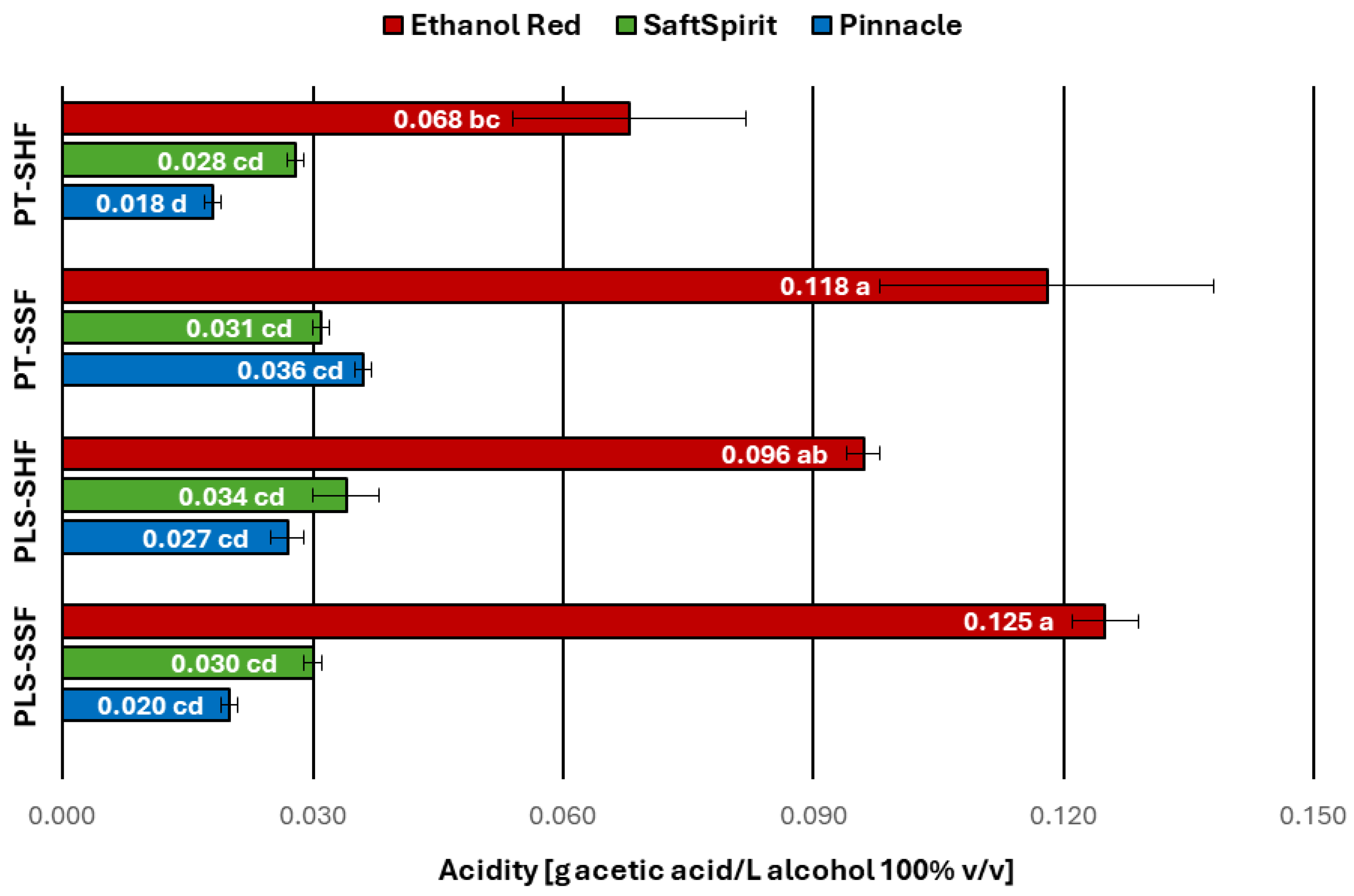 Of the distillates tested, one sample obtained using the Ethanol Red strain (PT-SHF variant) and all samples produced with the Pinnacle and SaftSpirit strains exhibited acidity levels below the permissible limit. The distillates obtained with the Pinnacle and SaftSpirit strains showed acetic acid concentrations ranging from 0.018 to 0.036 g/L alcohol 100% v/v and from 0.028 to 0.034 g/L alcohol 100% v/v, respectively, without statistically significant differences between these two strains (Figure 3).