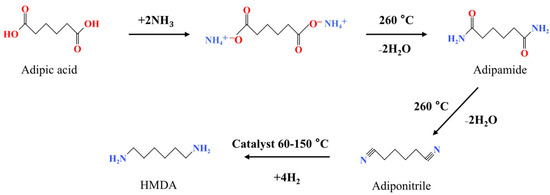 Bio-based amine compounds are widely used and have recently been studied intensively [10,11]. 2,5-Bis(aminomethyl)furan (BAMF), a furan-based diamine with an aromatic heterocyclic structure, plays an important role in the synthesis of polyamides and pharmaceuticals [12,13]. BAMF is a stable bio-based diamine with an unchanged furan ring (furan core) and two symmetrical aminomethyl groups. As a furan-based monomer, BAMF improves the heat resistance, mechanical properties and barrier properties of polymeric materials compared to chain diamines, due to the special natural barrier of motion and the stiffness of the furan ring [8,9,14]. This is expected to endow more functionality and added-value upon the polymeric materials. In addition, the monomer hexamethylenediamine (HMDA) of nylon 66 can also be synthesized by the hydrodeoxygenation of BAMF [15]. Current reports on the preparation of BAMF or 2,5-Bis-(aminomethyl)tetrahydrofuran (BATF) include the reductive amination of HMF, the reductive amination of HMFA and the amination of various derivatives of HMF [16,17]. All of these are still laboratory studies and have not yet been industrialized. The preparation of BAMF using FDCA has not been reported. Compared to HMF, FDCA is more stable and easier to store and transport, which make it more suitable as a raw material to manufacture bio-based BAMF. The preparation of BAMF using FDCA would be an interesting study and it is expected to achieve the large-scale manufacture of BAMF for polyamide materials. For the preparation of primary amine compounds by the amination of oxygen-containing functional groups, the reductive amination of carbonyl and hydroxyl functional groups is a commonly used and effective method [16,18,19,20,21]. The carbonyl functional group reacts with NH3 to produce imine, which is then hydrogenated to obtain primary amine [22]. And for the hydroxyl functional group, a carbonyl group is generated via dehydrogenation, which then goes further via the route of reductive amination of the carbonyl group [23]. The combination of these two reaction pathways contribute to HMF reductive amination for the preparation of BAMF [16,24,25]. However, the direct reductive amination of carboxylic groups has rarely been studied. Coeck et al. [26] first reported on the one-pot reductive amination of carboxylic acids to prepare primary amines, using RuWOx/MgAl2O4 as a catalyst and most monocarboxylic acids as reaction substrates, for which the yield of primary amines was high. However, it was very difficult to achieve the amination of dicarboxylic acids using this method, and the primary products were cyclization products, such as lactams or cyclic secondary amines. The highest yield of 30% was achieved in decamethylene diamine from the reductive amination of decanedioic acid, and yield of 0% was obtained for hexamethylenediamine (HMDA) from the reductive amination of adipic acid. Therefore, reduction amination is not considered a suitable method for binary carboxylic acids to prepare primary amines. To the best of our knowledge, the only industrialized example of diamine preparation from binary acid is the preparation of HMDA by ammoniation and the hydrogenation of adipic acid or adipic acid ester [27,28,29]. As shown in Figure 1, adipic acid reacts with ammonia to form the ammonium salt, which dehydrates to form adipic diamide, and then diamide dehydrates to form the adipic dinitrile, followed by hydrogenation to form HMDA. The dehydration is a heat-absorbing process that requires high temperatures, and the dehydration process temperature is as high as 260 °C [29]. This molten ammoniated dehydration pathway provides some ideas for the present work. In this work, a similar route was used in the previous exploration; however, a large gap was found between the thermal stability of the bio-based FDCA and the aliphatic adipic acid. Some related attempts were reported in this work, in which the FDCA was reacted with ammonia to form an ammonium salt, and it was found to be very difficult to produce an amide in a further dehydration. And the amide would be even more difficult to dehydrate in the following section. Dehydration requires high reaction temperatures, which contradicts the poor thermal stability of bio-based adipic acid FDCA. Therefore, the route of the ammoniation of aliphatic adipic acid is not suitable for bio-based FDCA. The route that is suitable for the preparation of diamines from bio-based diacids needs further thinking and exploration.
