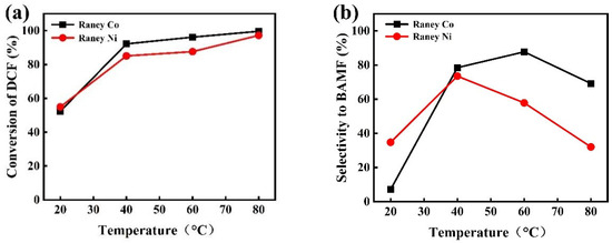 It is necessary to screen a suitable catalyst for the hydrogenation of DCF. Raney-type catalysts have a wide range of applications in the conversion of bio-oils [35] and the hydrogenation of glucose to sorbitol [36,37], as well as in nitrile hydrogenation processes, such as the preparation of n-butylamine by highly selective hydrogenation from butyronitrile [38] and the preparation of hexanediamine from adiponitrile [39]. Raney Co and Raney Ni were studied in this work for comparing their catalytic performance on DCF hydrogenation. As shown in Figure 4a, the conversion of DCF gradually increased with temperature increasing from 20 °C to 80 °C both with Raney Co and Raney Ni. The conversion with Raney Co was higher overall than that with Raney Ni. For the selectivity of BAMF, both Raney Co and Raney Ni showed a volcano curve with increasing reaction temperature (Figure 4b). The selectivity of Raney Co was also better than that of Raney Ni and achieved 87.7% at 60 °C (Table S2, entry 3).