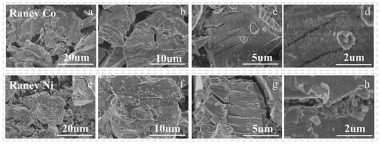 SEM (Scanning electron microscopy): SEM was used to analyze the surface morphology of Raney Co and Raney Ni on a Hitachi S4800(Hitachi High-Tech Corporation, Tokyo, Japan) with an accelerating voltage of 5.0 kV. Before the sample was observed, a small powder sample was glued to a conductive tape and sprayed with Pt for 90 s to achieve ion splitting.