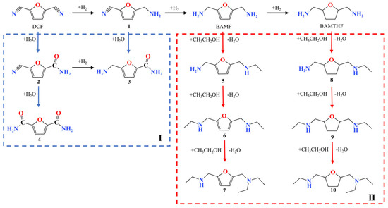 To more accurately identify the generated by-products during the DCF hydrogenation process, the products were analyzed using GC-MS. The reaction pathway for the catalytic hydrogenation of DCF in the ethanol system is summarized as presented in Figure 7. The cyano group at one end of DCF reacts with two molecules of H2 to form intermediate 1, then the cyano group at the other end reacts with another two molecules H2 to form BAMF. With further hydrogenation, the furan ring of BAMF is hydrogenated to form BATF, which is the main by-product. Along with the primary reaction, several side reactions also occur. There are two pathways for the formation of the by-products: the generation of amides compounds (2–4) in part I and the generation of secondary and tertiary amines (5–10) in part II. In part I (shown by the blue arrows), the cyano group of DCF reacts with water to form 2, and 2 could be hydrogenated to form 3 or further react with water to form 4. In part II (shown by the red arrows), BAMF reacts with ethanol to form the secondary amine 5, 5 continues to react with ethanol to form the secondary amine 6, and then 6 continues to react with ethanol to form the tertiary amine 7. The reaction pathway between BATF and ethanol is identical to the reaction between BAMF and ethanol, resulting in by-products 8–10. Therefore, in a further industrial experiments, attention should be paid to the side reaction with water or ethanol.