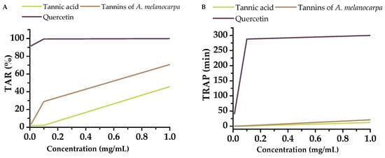 The TAR value of tannic acid was 2.2 times lower than that of quercetin at 1 mg/mL concentration. The TAR value of the Aronia tannin fraction was 1.41 times lower than that of quercetin and 1.54 times higher than that of commercial tannin at 1 mg/mL concentration.