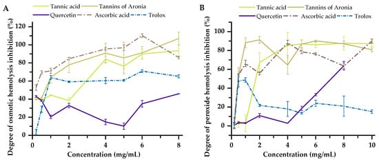 Ascorbic acid demonstrated concentration-dependent protection against free radical-induced hemolysis, with maximum inhibition (90.08%) observed at 10 mg/mL. Trolox showed significantly lower free radical scavenging capacity on erythrocyte membranes compared to the tested tannins. The membrane-protective effects of quercetin and Trolox were inferior to ascorbic acid—at 2 mg/mL, their efficacy was lower by 44.8% and 34%, respectively. Trolox efficacy varied within a 19% range at concentrations ≥ 2 mg/mL, while quercetin showed increasing protection at concentrations ≥ 4 mg/mL, though never surpassing the protective effect of ascorbic acid.