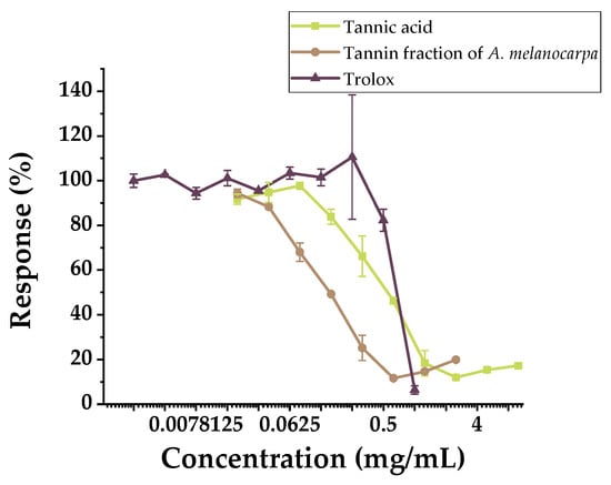 While flavonols and anthocyanins are known to contribute to the antioxidant properties of plant extracts [], we suggest that the residual amounts of anthocyanins and flavonoids in tannin fraction 9–11 are unlikely to contribute significantly to the overall antioxidant activity.