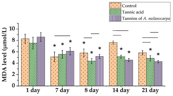 Both tannin types effectively suppressed the oxidative stress peak—on day 8, MDA levels in tannin-treated groups were 1.3-fold lower than in the control. By day 14, MDA levels in the tannic acid and Aronia tannin groups were significantly lower than control values by 1.5-fold and 1.7-fold, respectively (p < 0.05). Similarly, on day 21, levels remained lower than control values by 1.2-fold and 1.4-fold, respectively (p < 0.05). Notably, MDA levels in the tannic acid group were 1.14-fold higher than in the Aronia tannin group (p < 0.05).