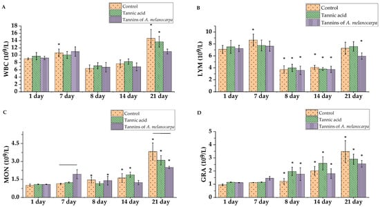 Leukocyte profile. (A) White blood cell count (WBC); (B) Lymphocyte count (LYM); (C) Monocyte count (MON); (D) Neutrophilic granulocyte count (GRA). * (p < 0.05)—Significant difference compared to Day 1 within the same group. – (p < 0.05)—Significant difference between treatment groups.