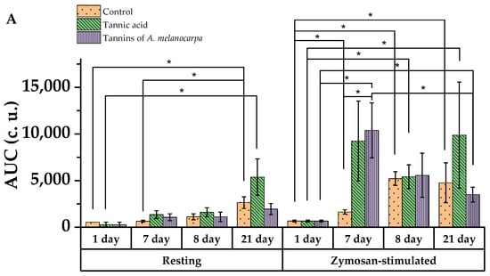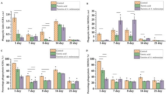 The percentage phagocytosis (PP), representing the proportion of active granulocytes (Figure 8C) and monocytes (Figure 8D), spontaneously decreased by 2-fold and 3-fold, respectively, in the control group by day 7, and by 3-fold and 2.7-fold in the group receiving the tannic acid solution (p < 0.05). In the group administered the Aronia tannin fraction, the granulocyte PP decreased 1.5-fold, while the monocyte PP remained unchanged. On day 7, the proportion of active neutrophils in the control was higher than in the experimental groups, and the proportion of active monocytes was 1.3-fold higher in the control group compared to the tannic acid group (p < 0.05).