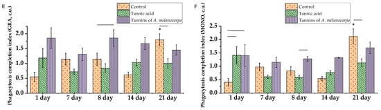 On day 8, the phagocytosis completion index (PCI) for granulocytes was 1.62-fold higher in the Aronia tannin group compared to controls (Figure 8E), while monocyte PCI was 1.54-fold higher than in the tannic acid group (Figure 8F) (p < 0.05).