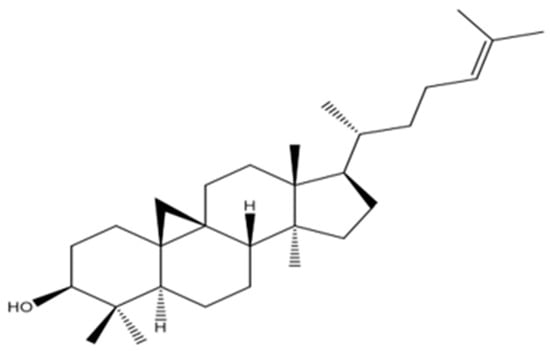 The chain was validated through 2D-NMR spectra, and structure analysis was conducted based on the correlations found in HMBC and COSY (COSY HSQC, HMBC, DEPT-135), and the COSY spectrum of PEEA-C3 is provided in Figure S10. The compound was named cycloartenol (PEEA-C3), and its structure was clarified and compared with the existing literature []. The proposed structure is represented in Figure 3.