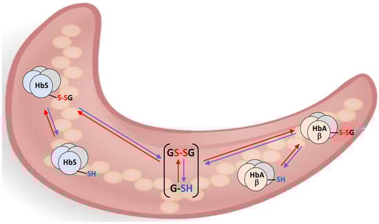 The response of the thiolome of RBCs to oxidative stress involves the reversible distribution of the glutathione pool among its soluble thiol (GSH), disulfide (GSSG), and hemoglobin-bound forms (Hb-SSG), as illustrated in the scheme of Figure 1 for the interplay of the glutathionylated forms of Hemoglobin A and S (HbA-S-SG, HbS-S-SG) in sickled RBCs.