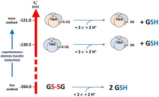 Briefly, it is assumed that, in the measured sample, the relative concentrations of “reduced” (thiol-free) and “oxidized” (mixed-disulfide) forms of the glutathionyl–hemoglobins correspond to those derived from the Nernst equation for the electrochemical cell pair of Equation (1)
