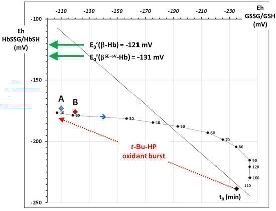 Plot of the Eh values of the glutathione (X-axis) and hemoglobin (Y-axis) redox pairs calculated from the oxidant challenge experiment carried out on wild-type, healthy RBCs [,]. T0 indicates the Eh before the oxidant challenge; black numbers indicate the Eh at progressive times during the recovery phase (from 10 min to 110 min). The two green arrows indicate the E0′ of the two hemoglobins studied in this report. The red and blue A and B diamonds show the values of Eh for HbSSG calculated for the two examined blood patients’ samples at admission and discharge, respectively.