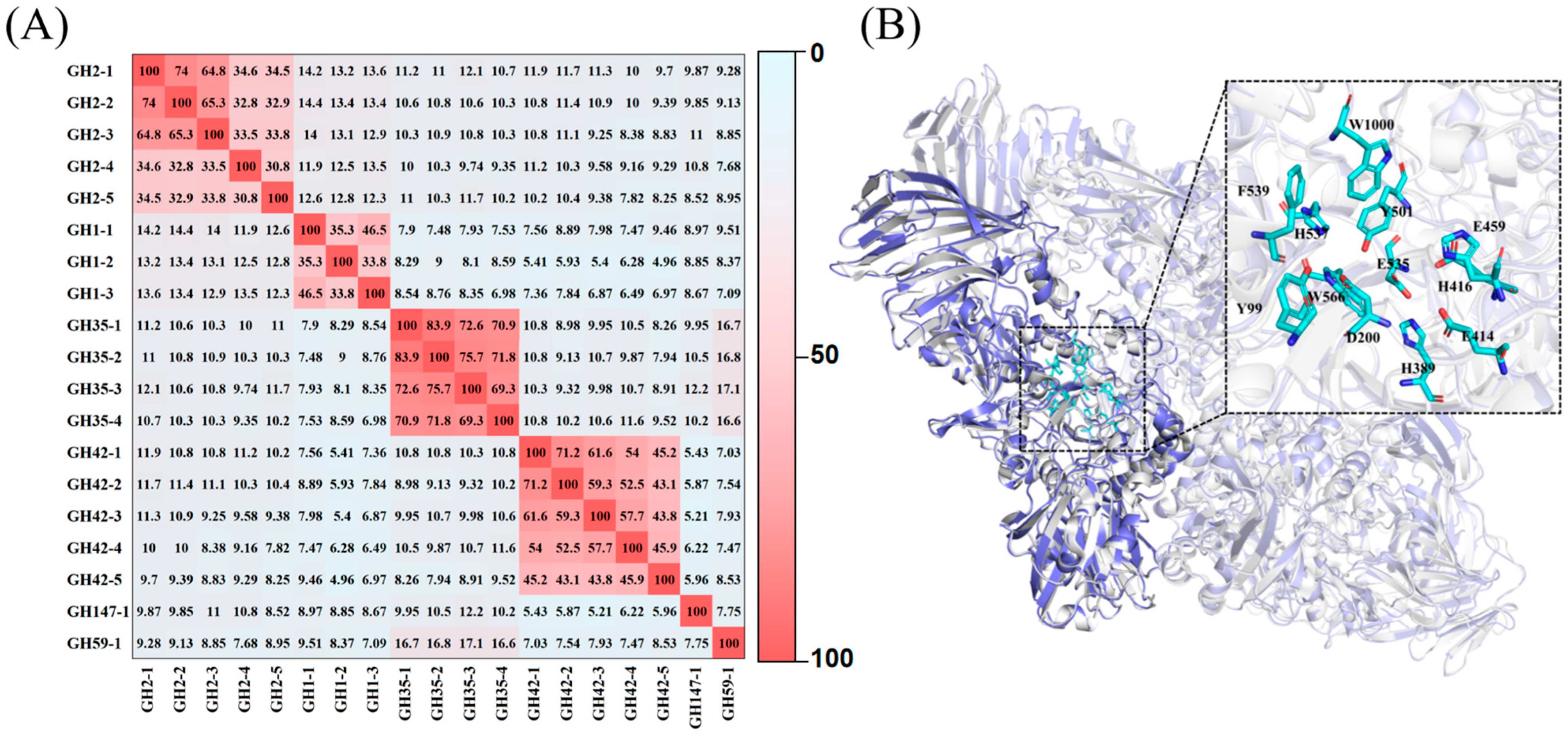 - Nakazawa, Y.; Kageyama, M.; Matsuzawa, T.; Liang, Z.Q.; Kobayashi, K.; Shimizu, H.; Maeda, K.; Masuhiro, M.; Motouchi, S.; Kumano, S.; et al. Structure and function of a β-1,2-galactosidase from Bacteroides xylanisolvens, an intestinal bacterium. Commun. Biol. 2025, 8, 66. [Google Scholar] [CrossRef]