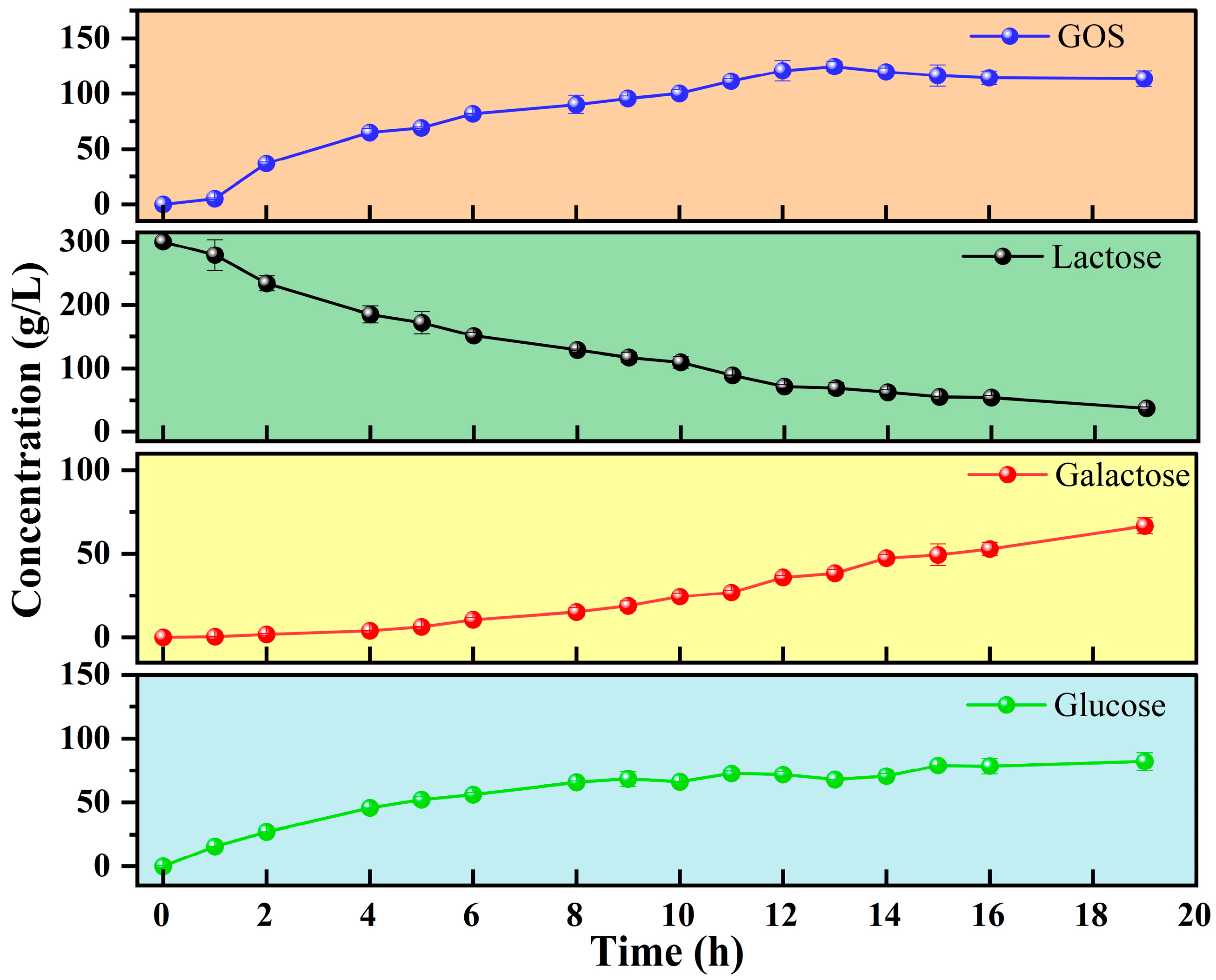 - Wang, G.X.; Jiang, J.; Liu, L.H.; Huang, J. Recombinant beta-galactosidase derived from Enterobacter cloacae Zjut HJ2001 for efficient biotransformation of galactooligosaccharides. Biochem. Eng. J. 2024, 212, 109514. [Google Scholar] [CrossRef]