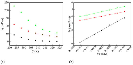 Viscosity values were further fitted as a function of temperature by the Arrhenius Equation (3) and the results are shown in Figure 2b.