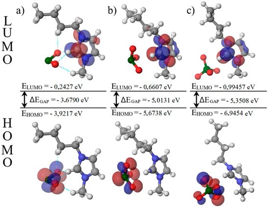 The initial stage of computational DFT simulations involved geometric optimization of [Bmim][ClO2], [Bmim][ClO3], and [Bmim][ClO4]. The optimized structures are shown in Figure 5.