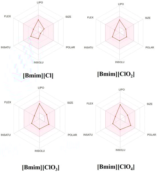 In silico pharmacokinetics, drug-likeness and medicinal-chemistry friendliness were computed for the four ionic liquids (Table 5). Drug-likeness was visualized with bioavailability radars (Figure 9). The optimal ranges used were lipophilicity XLOGP3 between −0.7 and 5.0; molecular weight 150–500 g·mol−1; polarity (TPSA) 20–130 Å2; aqueous solubility (log S) ≤ 6; saturation (fraction Csp3) ≥ 0.25; and flexibility (rotatable bonds) ≤ 9. All four compounds meet these physicochemical criteria and show 0 Lipinski violations [].